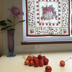ブルームーンと🍒🍒 🍒のUSAコットンで のれん作りました♪ キッチンの窓辺に薔薇一輪❤️