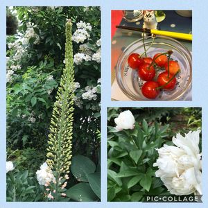おはよう😃ございます🍒 エレムルスが咲き始めました♡ 今年は二目上がっていたのに 途中から一本いじけてしまいました😭。残念❗️ 🍒佐藤錦 昨日15粒収穫しました。 少なくて食べるの可愛そう でもサラダ🥗の横に飾って 😋食べちゃいました😝。 白い芍薬が隠れて咲いてます。