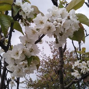 サクランボ佐藤錦の花、こんなに白っぽかったのね〜曇り空で寒そうに見えるな☁️ 異品種植えていたけれど枯れちゃったので実はなりません💦