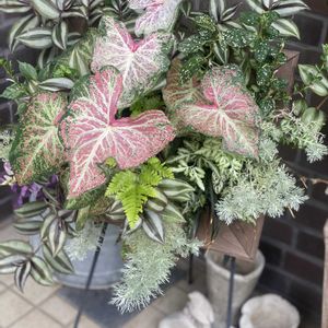 猛暑の夏でもへこたれない 生育旺盛な額縁🖼️寄せ植えです 大好きなハート型の『カラジューム』を この角度で鑑賞できるのは 最高です❣️ 毎年夏の定番で決定でしょう♪ もう額縁が見えないほどに 育ってます🫥 まるで空中に浮いてる寄せ植えに 見えてます🤭 そろそろ✂️を入れる前に 記念撮影しました📸 何度も見て貰ってありがとう😊
