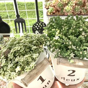 放置で可愛いSedumやカンチアさん❤︎ 冬は地上部が枯れたりで見た目が悪くなるけど春から勝手に再生してくれて可愛いので好きです🤗❤︎ 伸びたらカットして挿しておく、くらいの事しかしてません、死んだと思っても生き残りが勝手に再生してくれます😇写真の子も冬はどれもスカスカ、見た感じ枯れ枯れでした。とにかく管理が楽❤︎
