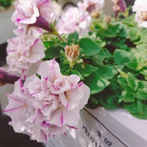 🤍ペチュニア VIVA🤍 ホワイトの八重のお花に濃い紫のベイン(脈)が入っています。 少しお花が小さくなって、ボリュームも減ってきました。でもずっと咲いてくれていますよ🥰💕
