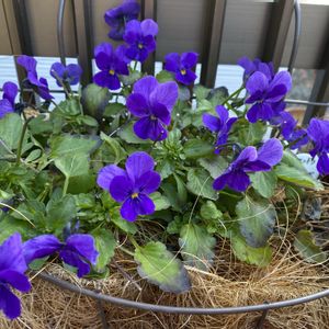 2025年2月 zaijinビオラ 頭ぶつけて痛いから洗濯ラックに 移動させられたバスケット寄せ植え シークレットベインとzaijinビオラとヒナソウ、きゃわいいね〜