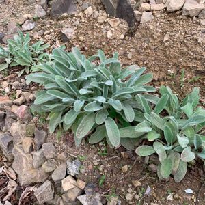 ラムズイヤー庭植え後。雨水の泥跳ねで葉に土がつきます。他にも何か植えなきゃいけないなと思います。