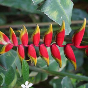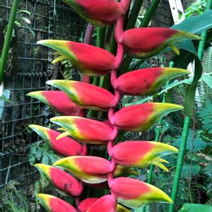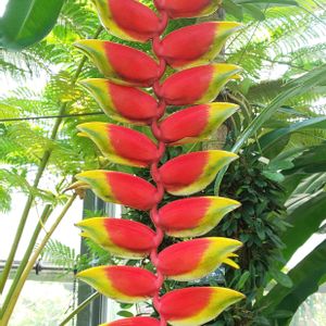 ヘリコニア・ロストラタ 学 名 Heliconia rostrata 科 属 オウムバナ科ヘリコニア属 ヘリコニア属は熱帯アメリカや南太平洋諸島などの熱帯地方に100-200種が分布する。属名は、ギリシャ神話に登場する芸術の女神ミューズが住むヘリコーン山に因む。葉は60-120cmの長楕円形。花序は下垂し、花苞は、色は赤色で先端が黄色、2列生に12-30個つける。苞の中に淡黄色の花をつける。