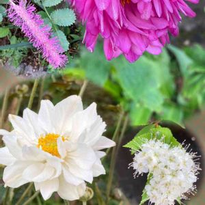 ↖️ヘクソカズラの実でしょうか? いつもすぐ刈り取るので花を見た覚えが ありませんでした。 追記 ムカゴと教えていただきました。 ↗️孔雀草が可愛い💕 ↘️アメジストセージが満開です💜 ↙️6月に咲いていた唐糸草が何故か咲いていました❗