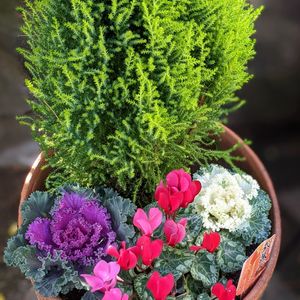 こんにちは。◕‿◕。 今日は風も強く寒くなりましたಠ_ಠ 今日のお花 ガーデンシクラメン 岡山県生産の2色ミックスの苗のガーデンシクラメン武蔵を葉牡丹と寄植えしました🌳♪~(´ε` ) 💜🤍💖♥️