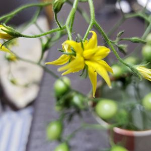 こんにちは😃 午後から雨☔です 涼しいです 🍅ミニトマトのお花💛 もう実が割れて収穫 不可能になってしまったので とりましたけど まだその中に青い実が いくつがありました 美味しく収穫🍅できて ありがとね❤️