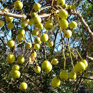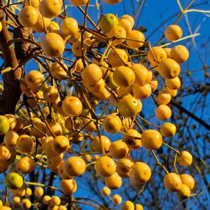 センダン(栴檀) 古名オウチ、アフチ センダン科センダン属 落葉高木 実が見えてきました 羽状複葉の葉は軸を残して 落ちずにいます 下の方では葉も実も 未だ緑色です🌿😊🎶