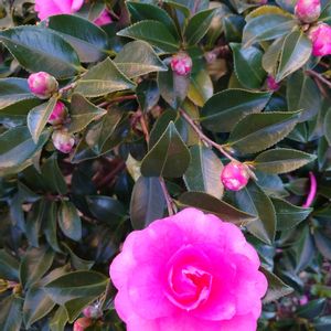 1️⃣鉄工所の花壇の紅葉する木々です。 2️⃣整骨院のクリスマスホリー 3️⃣綺麗に剪定されたサザンカです。 4️⃣お向かいさんの八重咲きサザンカです。今年は花が咲く前にご主人が切られたので 花が少ないです。 5️⃣通り道のお宅のヤツデとヒイラギです。 🏷️木曜日は木 🏷️木曜日は木に咲く花