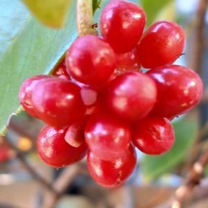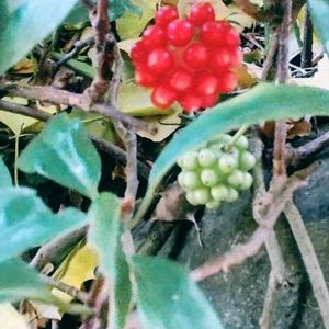 今日のお花 サネカズラ マツブサ科サネカズラ属 つる性常緑木本 今年はサネカズラの実が豊作のようだ! あちこちできれいな集合果を見つけることができた!🥰 常緑とはいえ紅葉した葉と熟れゆく果実 どの段階も味わい深い❕ 4枚目 初めて見つけた雌花