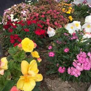 銀行の入口の花壇です。 手前の黄色い花はリーガルベゴニアで いいんでしょうか? 普通のリーガルベゴニアに比べて お花の大きさが2倍以上もありびっくり😲