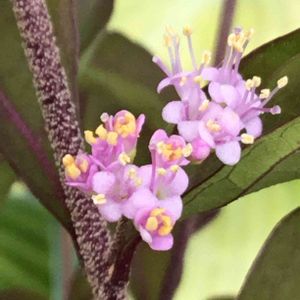 コムラサキシキブの花が咲きました 去年紫の実が付いている時にお迎えしたので初めてお花を見ました ピンク色の可愛らしいお花が集まって咲いていました