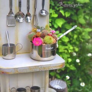 私のお庭の お気に入りの子たち キッチンガーデン風にして カトラリーを壁に掛けてます その横にアルミカップや調理器具に可愛い植物たちを入れて おままごと気分で楽しんでます たまにジャムの瓶にお庭で咲いたお花を入れて一緒に飾ったりすることも✨ お庭のサボテンたちが 今ちょうど満開でとても とてもカワイイです🌸✨✨ オンラインショップにも少しアップしました