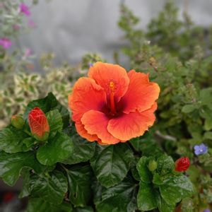 🌺ハイビスカス・トロピカルオレンジ🌺 去年、水差しで冬越しし🌿 春になって挿し木に🌿 蕾がつき❇️ 今日花が咲いてくれました✨🧡🌺