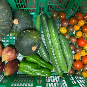 今日の収穫 おはようございます☀ 暑い日が続きますね💦 36度ちょっと異常 右からミニトマト🍅 きゅうり ジャンボピーカン 南京 イチジク 坊ちゃん南京らしいのが二個 新顔はイチジク
