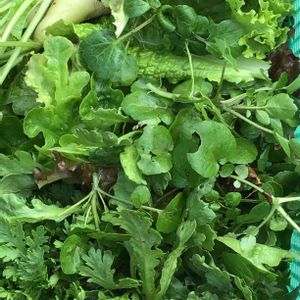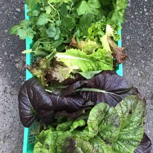 今朝の収穫 下から高菜、サニーレタス クレソン、セロリ、ミニセロリ