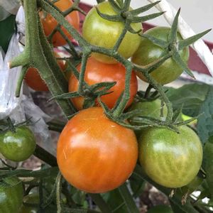 ナイロン トマト🍅 ナイロン掛けたトマト🍅 明日収穫します 順調に赤くなっていますが 採りどきが有りまして 赤くなる迄待つと 弾けます(T . T) この位が採り頃かな😊 3回目収穫10個予定🍅 今日スクモを頂き 下に撒きました 少しは保温効果があるかな❓