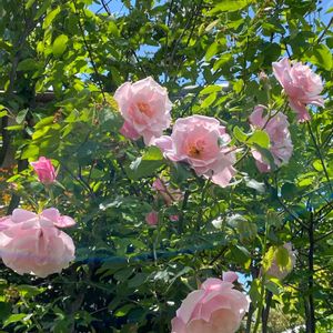 パーゴラの上のバラばら🌹 スパニッシュビューティ がチラホラ咲き始めました。 今日は青空のもと 先進んだかな〜😀