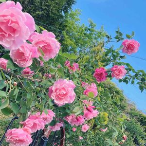 スパニッシュビューティーが咲きました✨ 可愛いピンク🩷に香りも良くて最高です♪ 挿し木から育てて去年は摘蕾して苗木を育てたので、初めて花を見ます。 まだまだ小さな苗木です。 パーゴラに誘引して下から花を見降ろせるのは何年後かな? とっても楽しみです‼︎