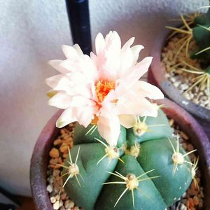 ただいまです♪ ジョイフル本田富里店ガーデンセンターからお迎えしたのは……… ギムノカリキウム属ペンタカンサ、別名「聖王丸」さんです! 大きさは、5cm位です。 帰りのバスで調べたところ、半日陰推奨、水好きだそうで、ウチの窓辺でもいけるのではないかと思います。 大丈夫かな…?(°∀°) この丸いまま、維持できたらいいなぁと思っております (๑•̀ㅂ•́)و✧