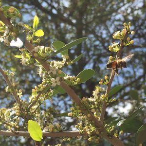 木々の花が開花すると蜂🐝さんがたくさん飛んで来ます〜🌼ちょっと怖いけど。 白い小さな花が咲きます。葉っぱも2センチから3センチ位で小さく、常緑樹です。