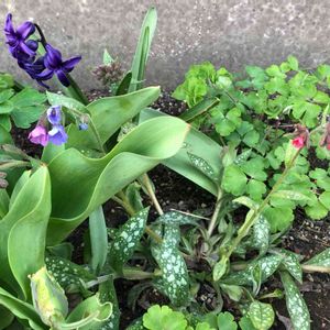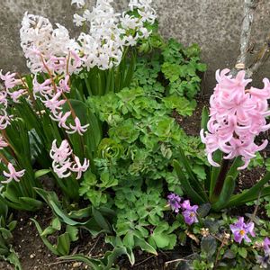 やさしい色のヒヤシンス達〜💖 ヒヤシンスの下のグリーンは オダマキの葉🌱間も無く全ての植物を覆い隠すようにモリモリに なります😅 東側花壇にて〜💕