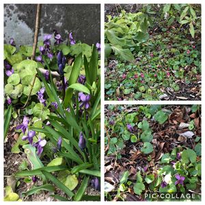 庭のスミレ〜💜 今日現在2種のタチツボスミレが咲いてます💕 左は紫のタチツボスミレと紫のヒヤシンス のコラボ💜💕 右上はちょっとピンクがかった タチツボスミレ💕 右下は紫のタチツボスミレ💕