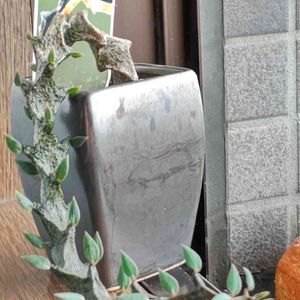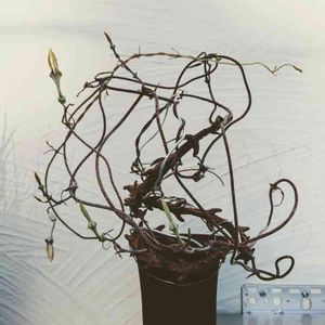 セロペギア キミキオドラ、左の画像親株で、只今キモ可愛い花が咲いてます😍 右の画像は春に撒いた実生苗です☺️ 蔓性のガガイモ の一種だそうです。昨年タニ友さんより頂きまして、無事冬を越し、なんと❗️種もとれまして😆💕 とりあえず撒いてみたところ、これまた発芽率が抜群で🤣 しかし、芽は出たけど、なかなか大きくなりません😅 しかもネットを探しても育て方が全くわかりません😂😂😂 どなたか育て方わかりませんかー?💦