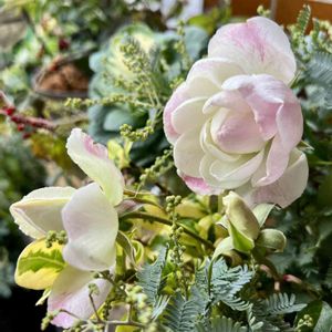 こんにちは♪ 先月剪定したピンクアイスバーグの蕾を同じく剪定したミモザの枝と一緒にダメもとで空瓶に挿しておいたら咲いてくれました🎶😃 バラがない時期なのでとても嬉しいプレゼントです🎁