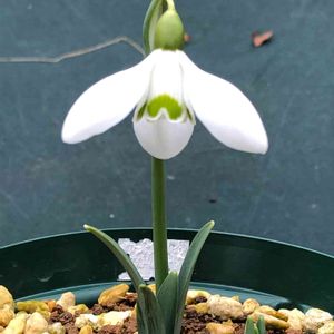 Galanthus'S.Arnott' 1月19日に地表に芽がのぞいてから、やっと開花しました。 よく見ると、少し離れて一つ芽が出ています。 楽しみが増えました。
