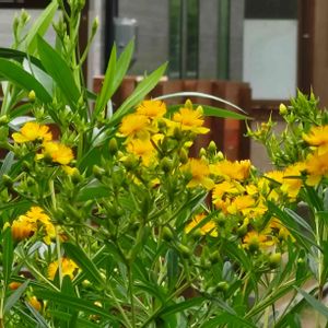 雨に打たれる細葉ヒペリカム 期待以上の雨になりました。 夜まで続く雨の様ですが、雨足は控え目希望です😅