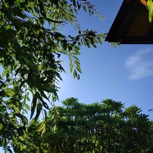 枝垂れ桜とユズリハの緑🌿 青空がまぶしい‼️ そして暑いっ‼️