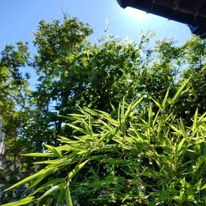 大きな素焼き鉢に入れてから地面に植えた竹。 涼しげです✨