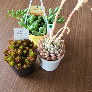 こんばんゎ♪(,,• •,,)☆.。º:* 今日はクニさんさんと 多肉屋梅さんの販売会に行って来ました💕 梅さん手作りの木製プランターに、購入した寄せ植えセット(なんと300円‼️)と我が家の多肉をプラスして、早速寄せ植えしました🩷❤️🧡💛💚🩵 上段奥のオーロラ 丸葉万年草は おまけで頂きましたよ❣️ 購入したのは、 コーラルカーペット オリジナルザラゴーサ チョコレートムース ヒューミリス です。 クニさんさんにいただいた三色のにぃさんで にぃさんの日🏷️参加しまーす❣️