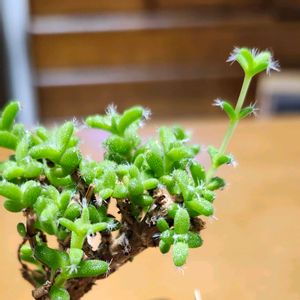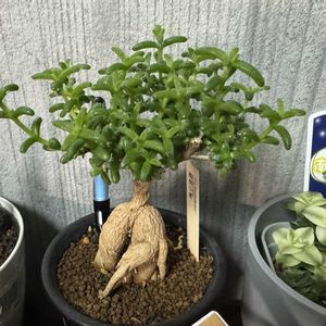 ①何の花でしょう( ◜𖥦◝ ) ボトルツリー 初めて花が咲いたよ 足元ぶっとんこなのに お花控えめ꒳꒳ ②上から ③全身 朝日を浴びてキラキラ∗*゚ ④私足元凄いんです。 足元が太るのでボトルツリー🌳 先月植え替えたとき 掘り出したら 左下状態で (°∀°)ヒィィィィって 言っちゃった꒳꒳ ⑤オマケ 2階のベランダ住みの 姫紅小松さんの所まで 逢いに来てくれた ヤマトシジミ。 あーシジミってやつ(蝶)どれもかわいいなぁ🥰