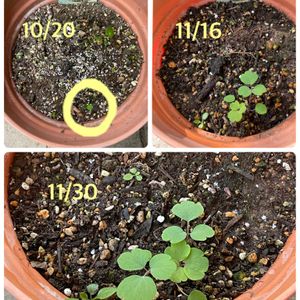 あっという間に師走。 今日は風が強いので落ち葉掃除が忙しくて大変です。 風向きが良くなくて 我が家の落ち葉がほとんどお向いさんのガレージに吹き込んで渦巻きしてる 🌀🍂🍁🍂🌀 ごめんなさい🙇♀️ 日々の生活に追われてGSの投稿2ヶ月も空いててお庭の記録更新できていませぬ。 いやいや、お世話さえ手抜き三昧。 秋冬のビオラ達もお迎えできず今年も終わるのかな。 ① オダマキピンクペチコート 10/20 宿根草だから猛暑からの復活を待っておりました。 傍に小さな芽が🌱いくつか発芽しているけど、雑草なのか?零れ種なのか?判別つかずそのままにしておきました。 11/16 親は完全に枯れてしまったようでこれ以上待っても出てこない感じ。 発芽したうちの1つ 手前の子が双葉から本葉に成長してる! この葉っぱの形は子孫?! 11/30 抜かなくて良かった! これオダマキですよね? これまで何回も採取した種を蒔いたのに一度も発芽してくれた事はありませんでした。 こんなにあっさり自然がオペレーションしてくれるなんて…感激❣️ さてこれからどうする? 鉢の真ん中に移動させた方が良いかなぁ。 ②野良アルストロメリア 母が鉢植えから引っこ抜いてポイっと庭に投げてた一本がサバイバルしてた例の逞しい子。 今健気に咲いてます。☺️✌️ ③ダイヤモンドリリー 昨年に引き続き開花してくれました。 もうすぐ赤が開花するのでそろそろみどりのまとめも更新したいです。 ピンクは今年も沈黙らしい。 ④今庭の子達 上 母の儚いサザンカ ハラハラと咲くひ弱な姿 中 クリスマスローズ 零れ種育ちを拾い上げて一年ポットの中で見守りましたが、根っこが下から出てきたので思い切って半日陰地植えにしました。 葉っぱ増えて安定してきたみたい。 この子は母が草むしりと称して一度全部刈り取ってしまった親株ニゲルの子孫です。 下 クリサンセマムマウントオービスク 以前のみどりのまとめの表示にもなったステキなマム様 でもね、オレンジとピンクのバイカラーだったのは初めの年だけ…その後はずっと濃い赤一色になってしまいました。 オレンジ色を咲かせるにはどうしたら良いのやら? ⑤フローズンクイーン まるでビフォーアフターみたいに老衰だわ。 残念ながら今年は開花しませんでした。😢 来年に繋げるため残っている葉に光合成頑張ってもらっています。 今週寒波が来たら全部枯れて休眠するのだと思います。 ━━━━━ ∙ʚ♡ɞ∙ ━━━━━ 娘が10年ぶりに年末年始を日本で過ごす事になりました。 忙しくなるゾ🥰 ━━━━━ ∙ʚ♡ɞ∙ ━━━━━