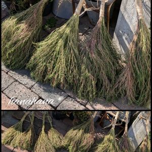 こんにちは☀️ コキア🟢🟢🟢 ここ2〜3年、育てていなかったのですが…我が家とお隣さんとの間の小さなコンクリートの隙間から芽を出し、グングン大きくなりました🙌 全然赤くならなくて…今か今かと待っていた矢先の一昨日、強風により折れてしまいました😭 ショックでしたが…取り敢えずいくつかに分けて束ねてみました。赤くなっていない状態でも上手くほうきに仕上がるのかな?? それにしても1本からこんなにも!! コキアのお腹…両手で抱きかかえられないほどの太さ!! 「密」‼️でした(笑🤭) ② 8/5この時は可愛らしかった💚 ③ 10/8 大きくまん丸に🟢 ④ 雨に濡れると重さで広がるので根元を麻紐で結びました。 ⑤ 折れてしまった😭 頭の重さに耐えられなかったかな🥲 こぼれ種から生まれたであろう小さな芽🌱が、水遣りもせずこんなにも大きくなって😳地植えって本当に凄いんだぁ~って、驚きと感動でいっぱいです!!