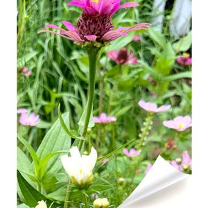 こんにちは☁☔ 今朝は過ごしやすいこと🥰 百日草とコスモスのコラボ…こんな風景も今日は秋らしく感じます p3 こぼれ種から発芽した百日草がいっぱいに…♡ だけど咲くところまでいくのかな?