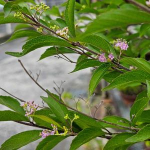散歩中 お庭に咲いている 「コムラサキ」? ①葉腋の少し上から花序が出ている ②葉の鋸歯は上方のみ が ムラサキシキブとの違いらしいが、、よくわからぬ ムラサキシキブにも会ってみたい