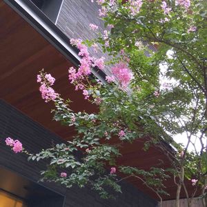 遠くからかわいーーピンク♪ いつもの お店🚲️~ 6月に初めてクチナシが 咲いてるのを知って 今日は南側に サルスベリの木が有るの 初めて知った🎶 2013年春のオープンから居たの? ピンクちゃん 、初めまして😌