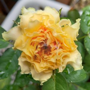 昨年切り花からの挿し木に初挑戦!! もともとのお花の力に助けられ何種類か成功しました♡ GSの中で仲良くしていただいている方々の中から、お三方に数種類を少々(無理やり)押し付け気味にお贈りして~~ (〃ノωノ)♡オハズカシイ それでもまだお嫁入り先を待つこもいるほど成功した元気なバラです 岡松ローズ【さざ波】🌹 待機中のポットで初開花しました