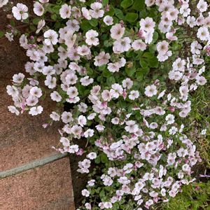 カーペットカスミソウ 昨年夏頃、ご近所の方からいただきました。 「春になったら枝垂れるように咲いて可愛いよ」 とわざわざ鉢植えにしたものを…😊 ほんとに可愛い💕 ピンクのすじが入っているけど白花ということで 🏷外は白い花