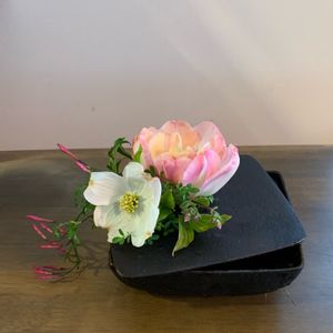 「 今日の花 ハナミズキ 」 小さな花器に挿しています𓈒𓏸𓐍 𓇢 ハナミズキ チューリップ カーペットカスミソウ蕾 ハゴロモジャスミン ミニバラの葉 ♻️リサイクル 前回お初の花器は蓋があり こんな風になっています♪