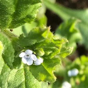 ハナイバナ(ムラサキ科ハナイバナ属) 公園の花壇に小さなハナイバナが咲いていました。 3ミリくらいの小さなお花、しゃがみこまないと見えません。 道端などに普通に見られます。和名は葉と葉の間に花がつくことからつきました。茎には白色の圧毛が上向きに密生します。葉は互生し、長さ2~3㎝、幅1~2㎝の長楕円形、縁に長毛が生えます。花はキュウリグサに似て、小さく、直径は約2~3㎜です。