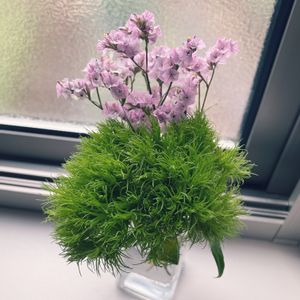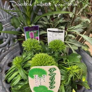 今日のお花 ナデシコ 購入後、家で記録用に撮ったpicなんでラベルが・・ 今はいらっしゃいません😭 又お会い出来たら嬉しいです✨ テマリソウ(手鞠草、学名:Dianthus barbatus 'green trick')は、ナデシコ目ナデシコ科ナデシコ属の耐寒性多年草である ビジョナデシコ の園芸品種。 花弁や雄蕊、雌蕊が、緑色の萼片のように変化し集合した形状は新栗のイガやマリモ(毬藻)のように見えます。 一般名:テマリソウ(手鞠草、学名:Dianthus barbatus 'green trick') 学名:Dianthus barbatus 'green trick' 別名:グルーントリュフ、スパークリン 分類名:植物界被子植物真正双子葉類ナデシコ目ナデシコ科ナデシコ属 原産地:園芸品種 草丈:30~70cm 開花期:5~7月 花色:緑 花径:3cm 花形:イガ状の球形 花弁:無 総苞色:緑 総苞形:球形