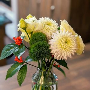 忙しい1日でした。色んな用事で家を出たり入ったり、駆けずり回っていました。 休憩に戻った時、キッチンのグラスに無造作に入れておいた残り物の花材や庭の剪定枝が綺麗だったので、お茶を飲みながらちょこっと花遊びしました。 花器にしたのは中国茶器です。 茶壺(急須)で淹れたお茶を茶杯(茶碗)に注ぐ時に使う茶海(ピッチャー)です。 束の間、楽しい休憩タイムになりました💠