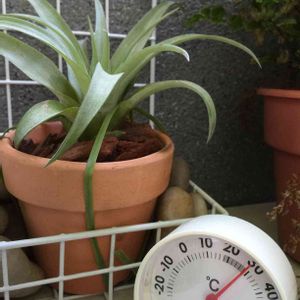 カピタータピーチ、やっと発根した! 外に置いてみた。 今まで乗せてた鉢をディッキアにあげちゃったので、こちらは余りもののプラ鉢で。 軽いから飛ばされないように他の鉢で挟んでるw