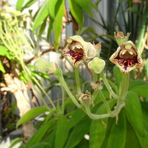 ちょっと不気味なお花 ウマノスズクサ科のお花です。 ダースベーダーが沢山ぶら下がっていました😆
