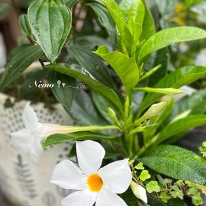 毎日 暑いですね。 溶けてしまいそうです🫠 エアコンをかけた部屋から出られず、お庭仕事もできず・・・ マンデビラ やっとモリモリ咲いてくれました。 白と真ん中に黄色🟡 が🤗涼しげ〜